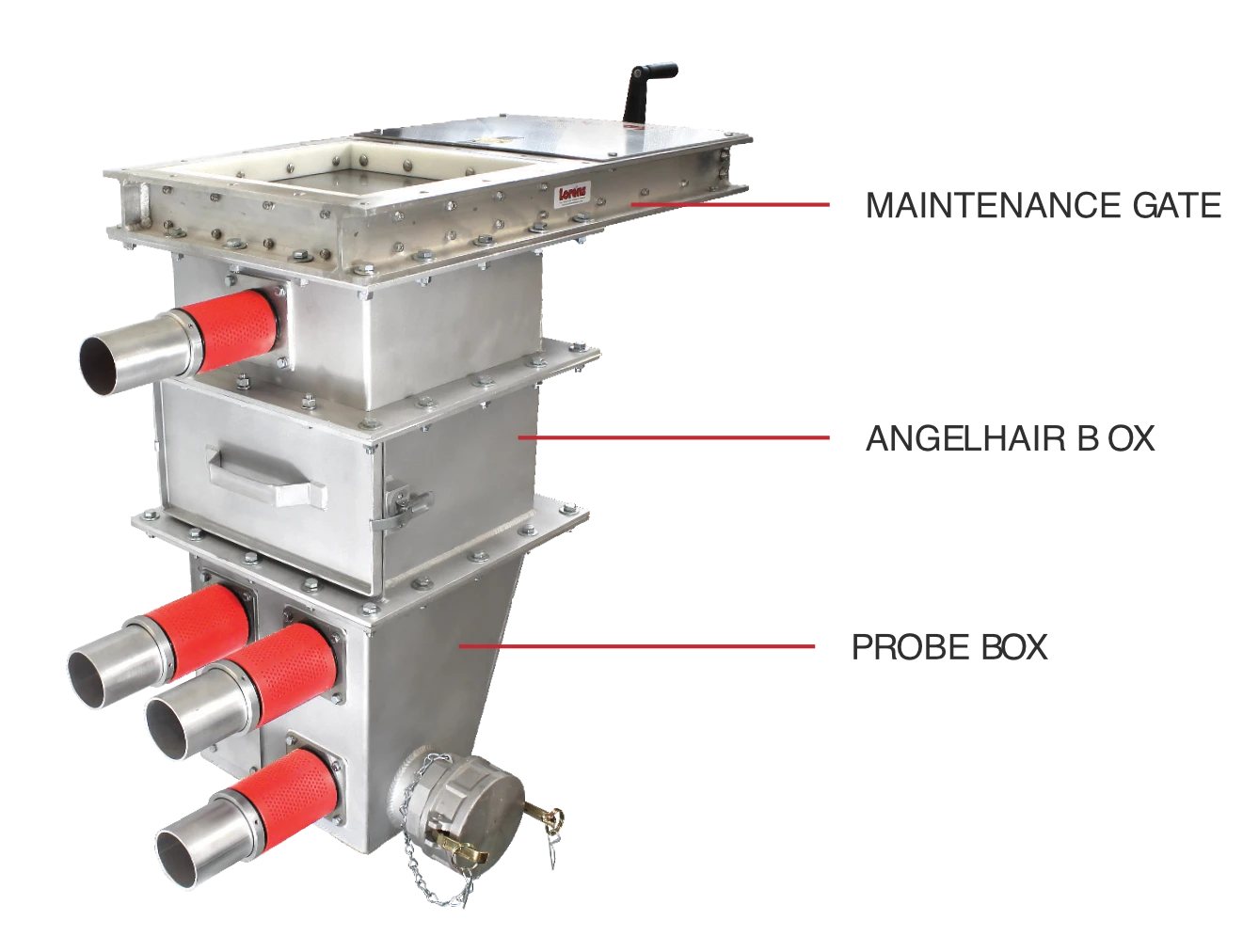 Angel Hair Traps collect “Angel Hair”, “Streamers” or “Snake Skins” common in the conveying of plastic materials at the base of a silo or storage bin in gravity applications.