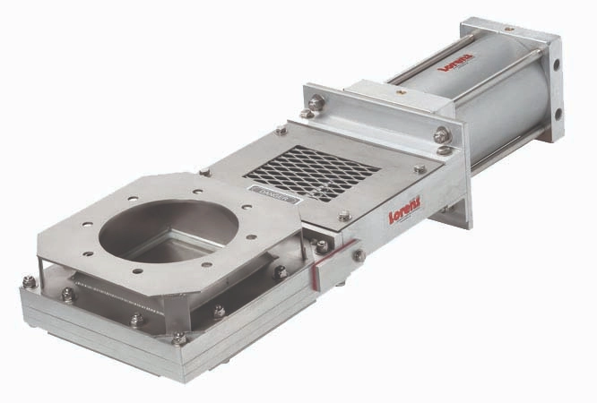 Pneumatic actuated Discharge Valve for gravity flow applications. Blade is sealed to differential pressures up to 15 psig top to bottom depending on the size of the gates. For use above rotary airlock to maintain pressures in the line below and eliminate air loss promoting continuous material conveyance.